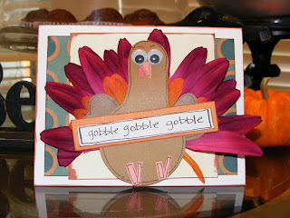 I made the turkey card for the die cut challenge. Technically it's not a die cut but a paper piecing. I don't have a die cut machine so I improvised. Isn't he cute. I love making these guys. This is the first one I've made for myself. I usually make them for Thanksgiving layouts that I'm selling.